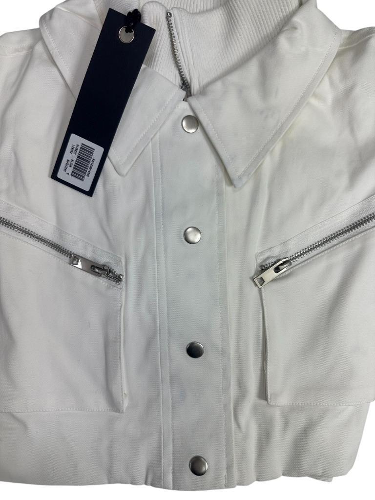 New With Tags I AM GIA Women's White Incepere White Crop Jacket Size XS New with tags and has never been worn but while taking pictures we noticed slight discoloration which we assume came from the black side of the tag rubbing against the jacket We have taken a photo of it Comes as shown