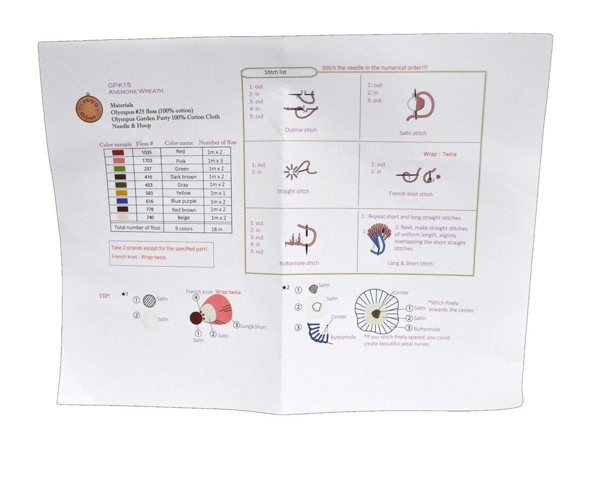 Olympus Garden Party French Embroidery Kit Botanical Wreath Floral Anemone GP-K15. Olympus Hand embroidery kit - Botanical Wreath - Flora Anemone - Cotton. Using GARDEN PARTY cotton cloth, which is easy to embroider even for beginners, it is an embroidery kit that allows you to learn stitching while being healed by the botanicals of the wreath pattern. It comes with a special hoop, so you can decorate it immediately. Cloth: Garden Party Cotton Cloth (100 percent cotton). Thread: Embroidery floss No. 25 (8 colors). Needle: Embroidery needle. Frame: Wood grain hoop frame. Size: 6.1 inches round (FR-P111). Instructions: Japanese and English. The circular hoop frame included in the kit is very useful. It can be used as a hoop during stitching, and as a decorative frame after stitchin