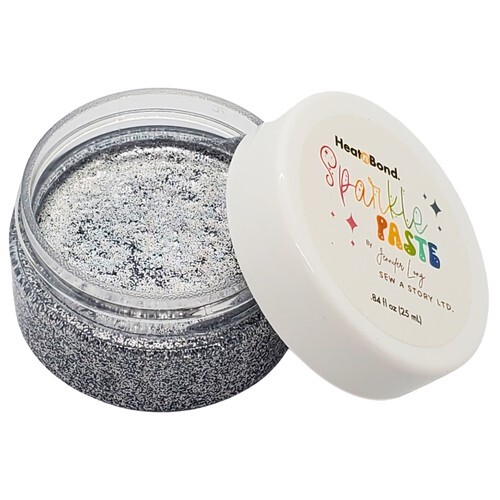HeatnBond Night Color Sparkle Paste By Jennifer Long Sew a Story 19151. Sparkle Paste is a heat-activated adhesive that adds a layer of glitter and shine to fabrics. Whether you are working on quilts, garments or home decor, Sparkle Paste brings a fun, radiant touch without the mess of traditional glitter. Available in 14 glittery, glistening shades, Sparkle Paste can be applied with a paintbrush to create freehand designs or with a small palette knife to create precise stenciled details. Each jar contains .84 fl. oz of Sparkle Paste. Color: Night. CHK-SP-19151