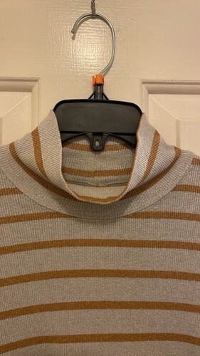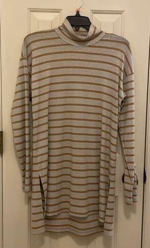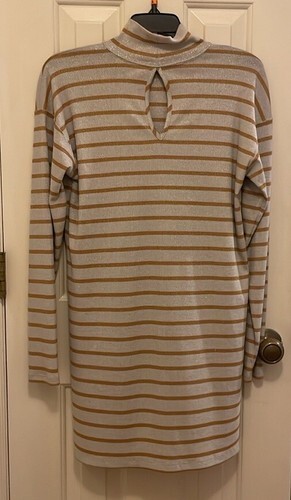Anthropologie Vanessa Virginia Mockneck Tunic Top in Metallic Gold and Silver Stripe. Size Small. Features lightweight stretch, mockneck style turtleneck, long sleeves, pullover, long style, side slits, keyhole back, soft.