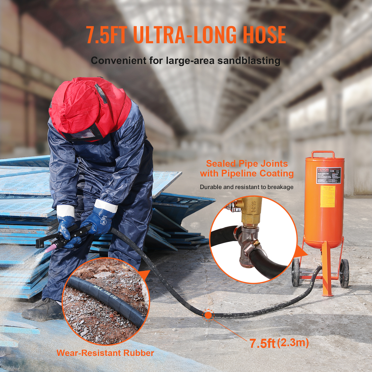 Ready for Action: Equipped with two 7.7-inch rubber wheels and 7.5ft long wear--resistant hose, our high pressure air sandblaster tank is easy to move and reaches hard-to-access areas. Plus, all pipe joints are sealed with pipeline coating for added durability and security.