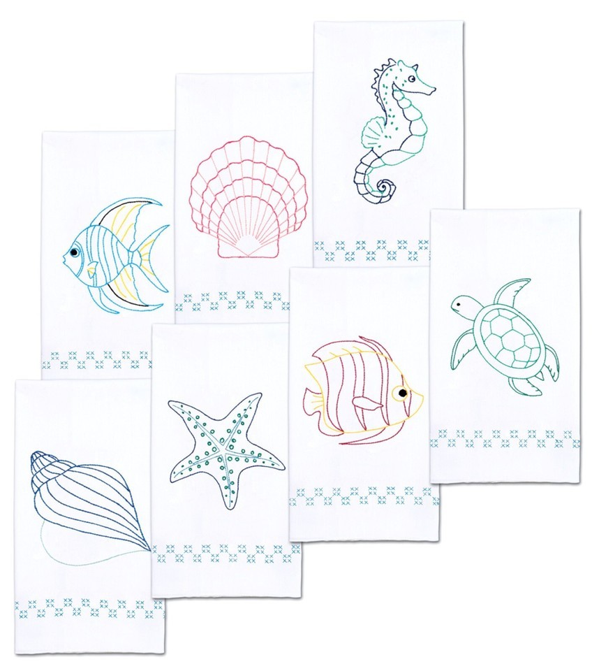 Package contents: Seven - 17 inch x 28 inch decorative hand towels of cotton/poly broadcloth with easy to follow instructions.