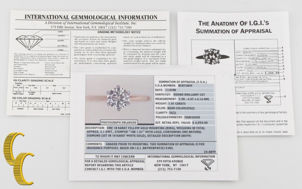18k Yellow Gold Solitaire Engagement Ring w/ Appraisal TDW =1.01ct/I/SI2 Sz 6.25