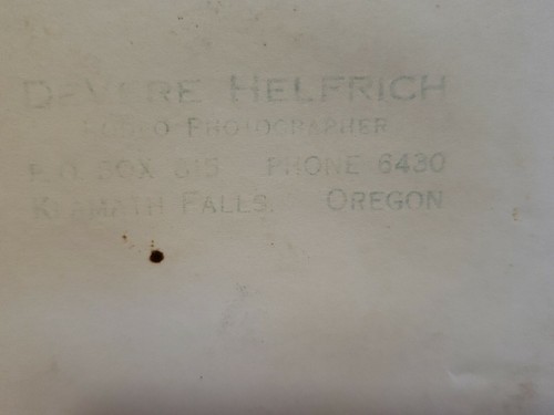 Authentic 1940's - 50's B W 8"x10" by the Famous Rodeo Photographer John DeVere Helfrich who is considered THE MOST FAMOUS and one of the most prolific rodeo photographers. I believe the writing at the bottom and the signature on the bottom corner are by DeVere's hand.