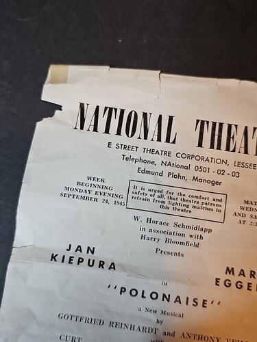 September 24 1945 National Theatre Playbill - W Horace Schmidlapp in association with Harry Bloomfield Presents - Jan Kiepura and Marts Eggerth in Polonaise a new musical by Gottfried Reinhardt and Anthony Veiller