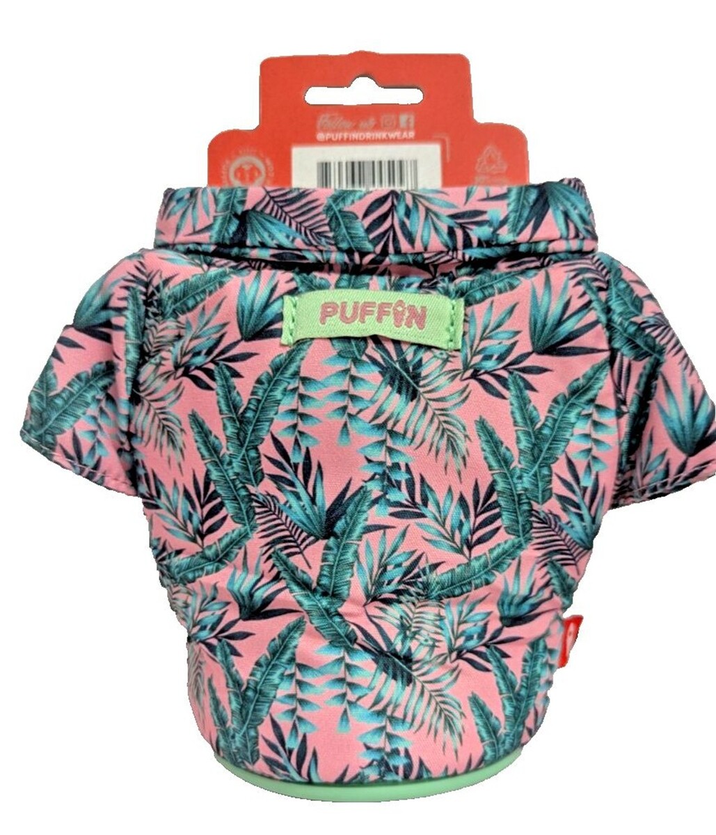 The product is a colorful 12 oz. koozie insulated drink holder by Puffin Drinkware, featuring an island tropical floral pattern.