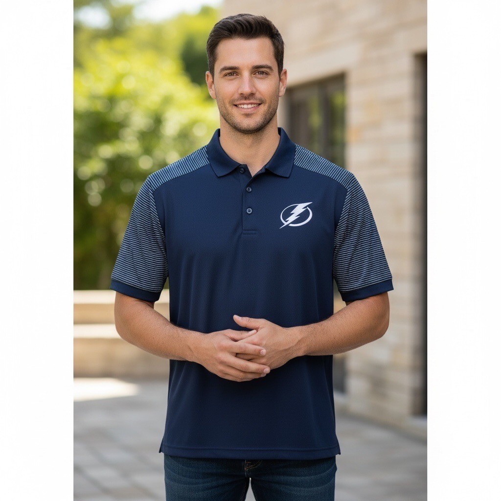 Men?s short sleeve performance polo by Antigua featuring the Tampa Bay Lightning embroidered chest logo. Navy body with contrast striped sleeves and yoke. Lightweight polyester fabric designed for comfort and breathability, ideal for golf, casual wear, or game day.