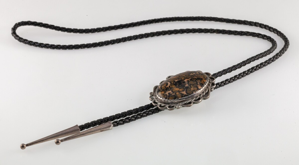 Sterling Silver Oval Handmade Leopard Jasper Signed Navajo Bolo Tie 36-inch