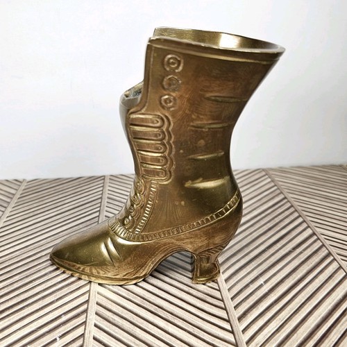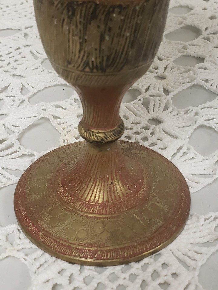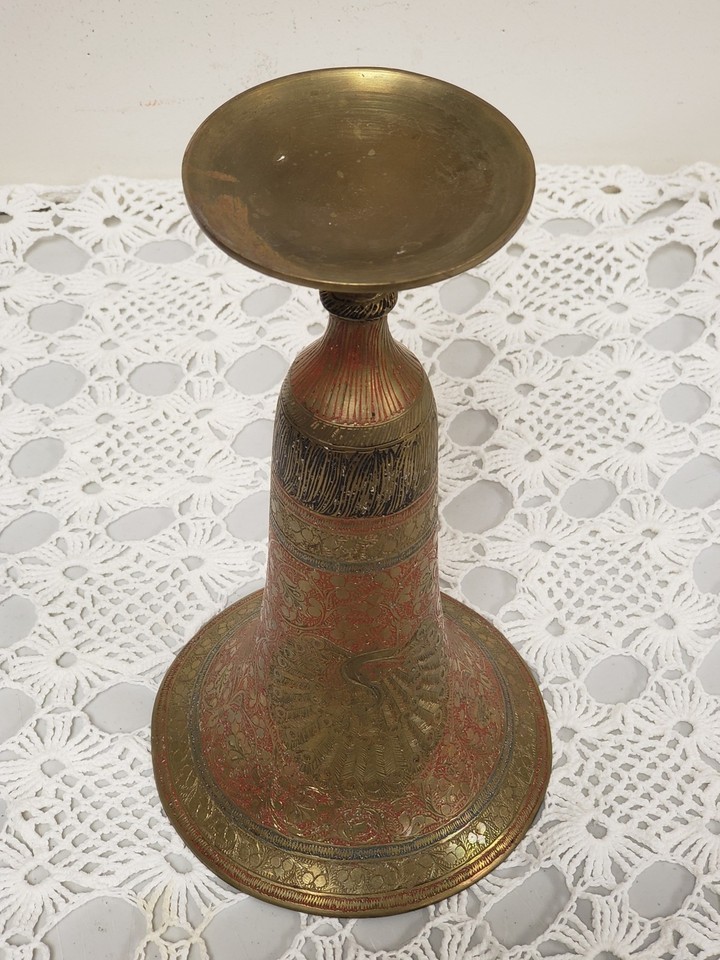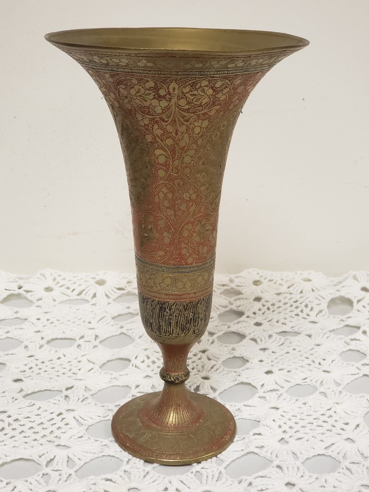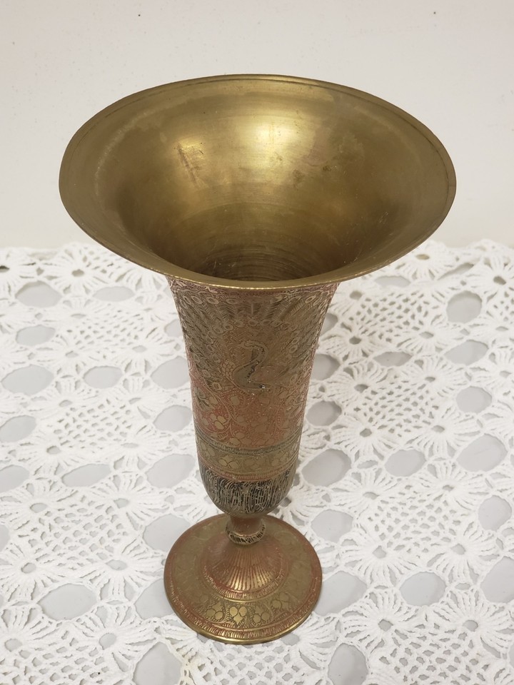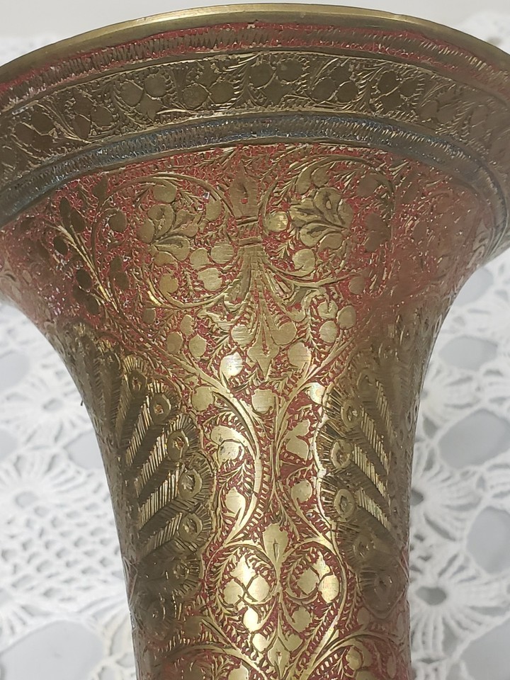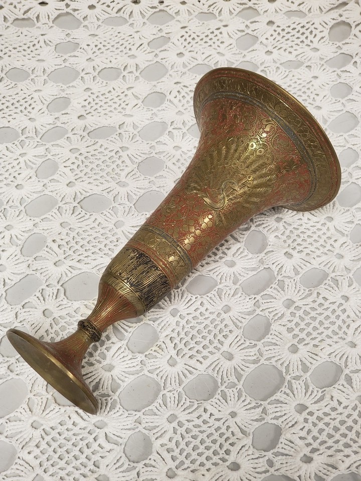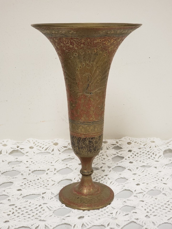 Vtg Ornate Hand-Etched Peacock Pattern 10" Solid Brass Trumpet Vase, India