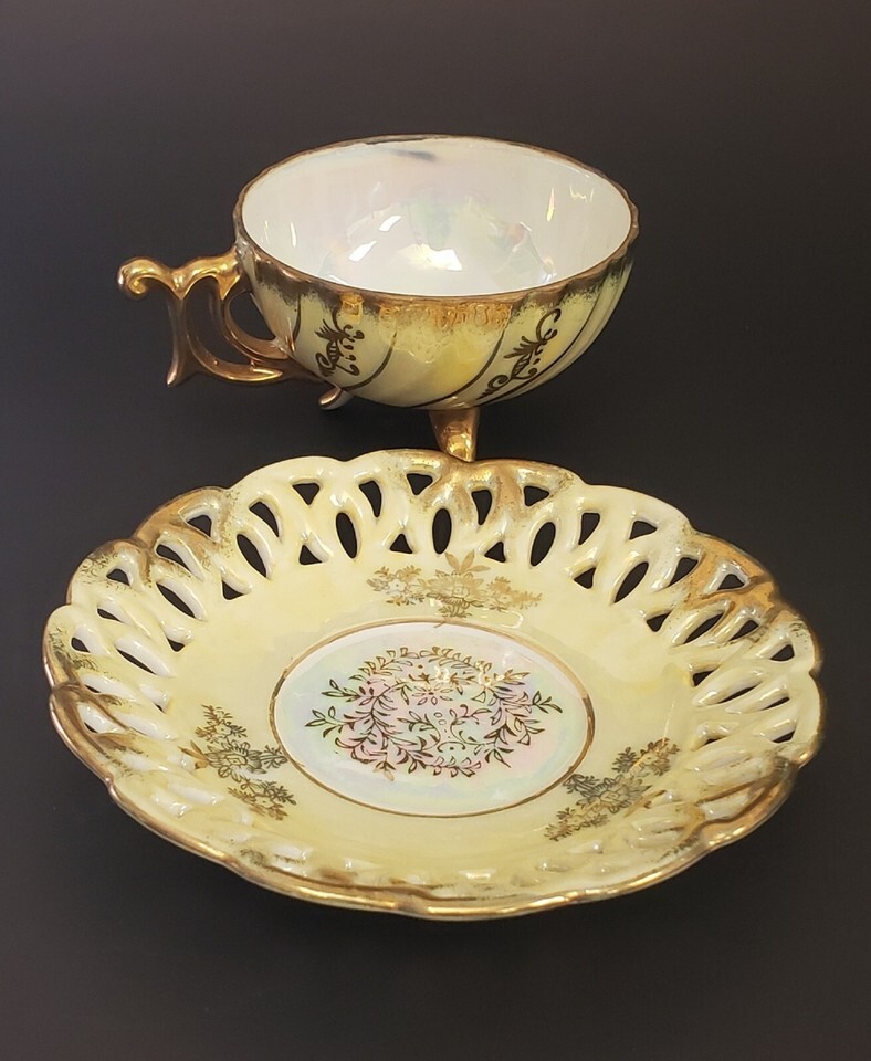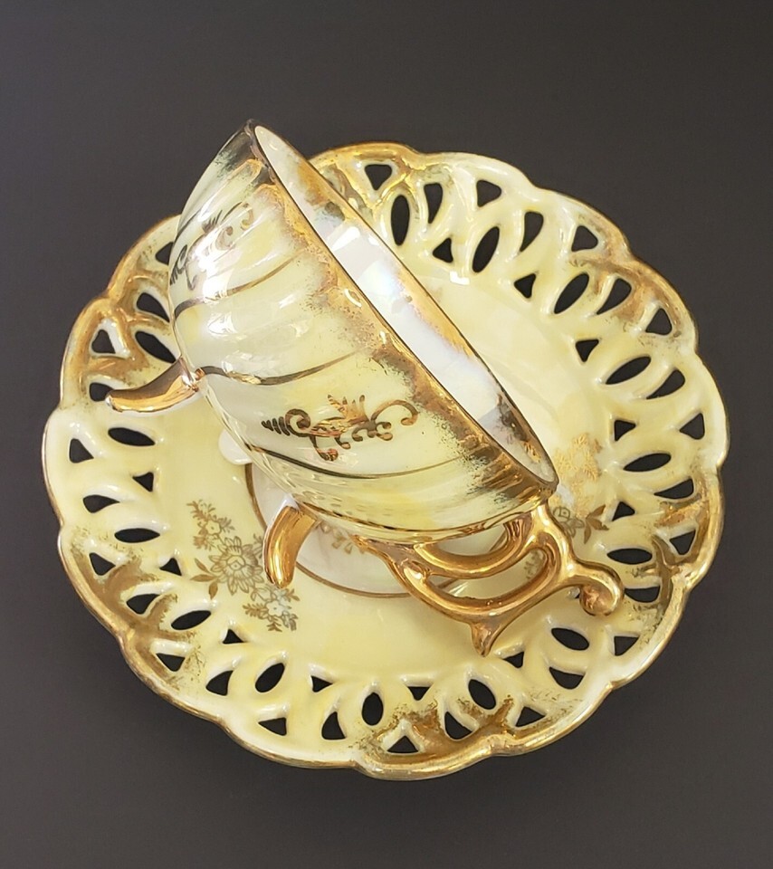 Vtg Hand Painted Gold-Yellow Lusterware Teacup Reticulated Saucer Set, Japan