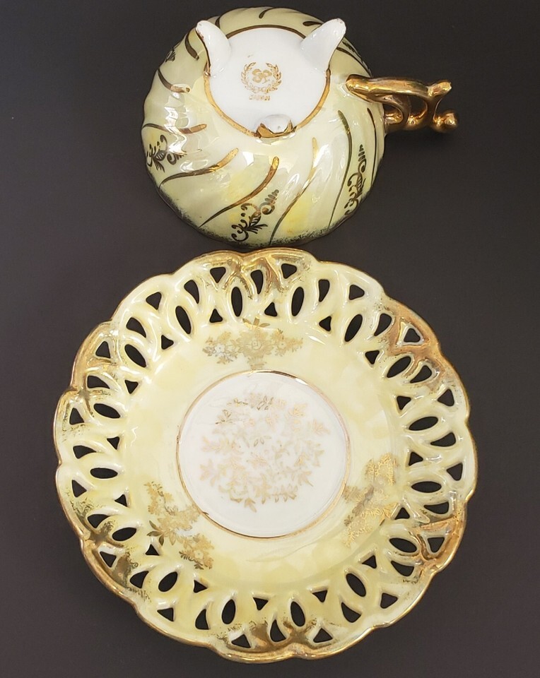 Rare find, lovely vintage Nippon Yoko Boeki Co, hand painted gold floral/foliage with heavy gold gilding and yellow lusterware swirl design, footed, detailed handle teacup and reticulated cut-out saucer set