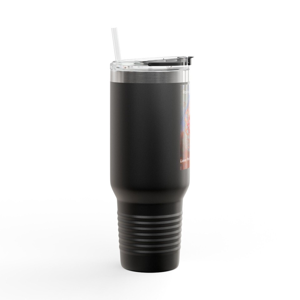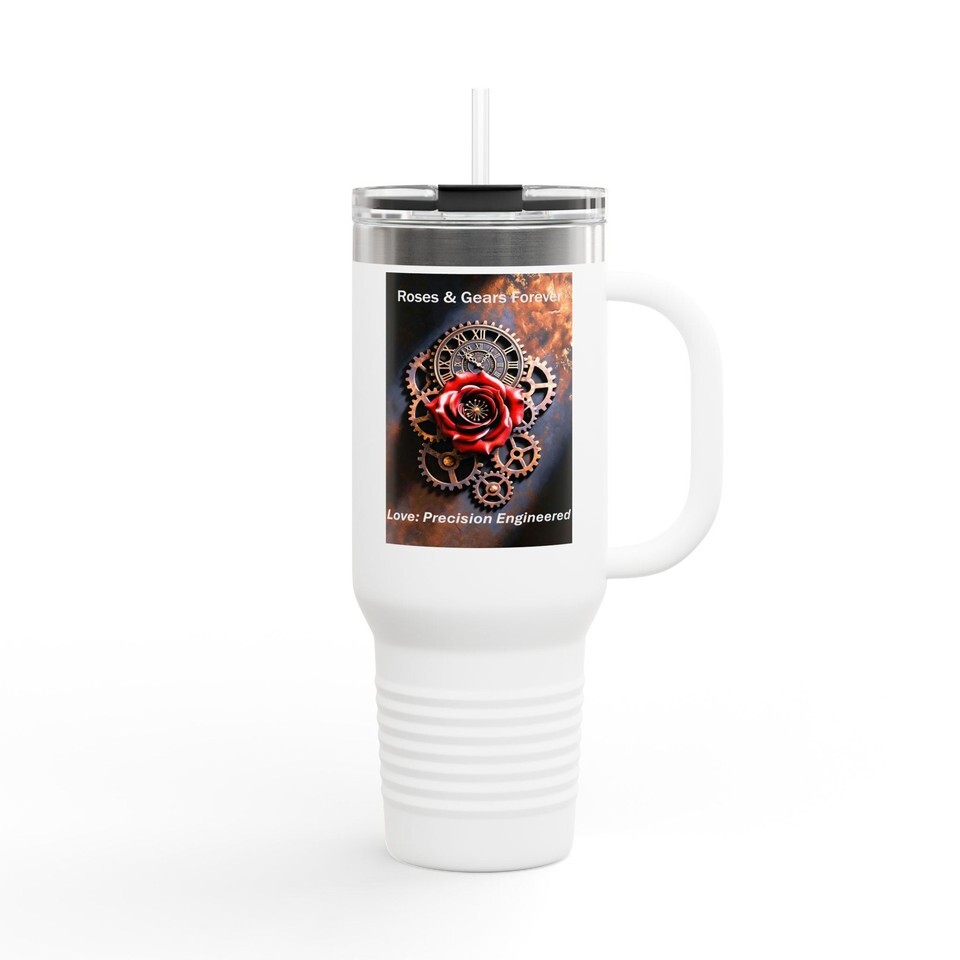 This 40oz insulated travel mug brings rugged reliability and detailed design into your daily routine. Built from durable stainless steel with double-wall insulation, it holds large pours of coffee, tea, or cold drinks and keeps temperatures steady for hours. The ergonomic handle and powder-coated finish make it easy to carry and resistant to scuffs, while the leak-resistant push-on lid and included straw let you sip confidently on the move. The printed panel showcases a striking gears-and-rose artwork ? a balance of precision and passion ? that stands out on the clean white body. Thoughtfully BPA-free and offered in multiple colors, this tumbler suits long commutes, hands-on workshops, and neighborhood coffee runs alike. Hand wash recommended to preserve the printed artwork and finish.