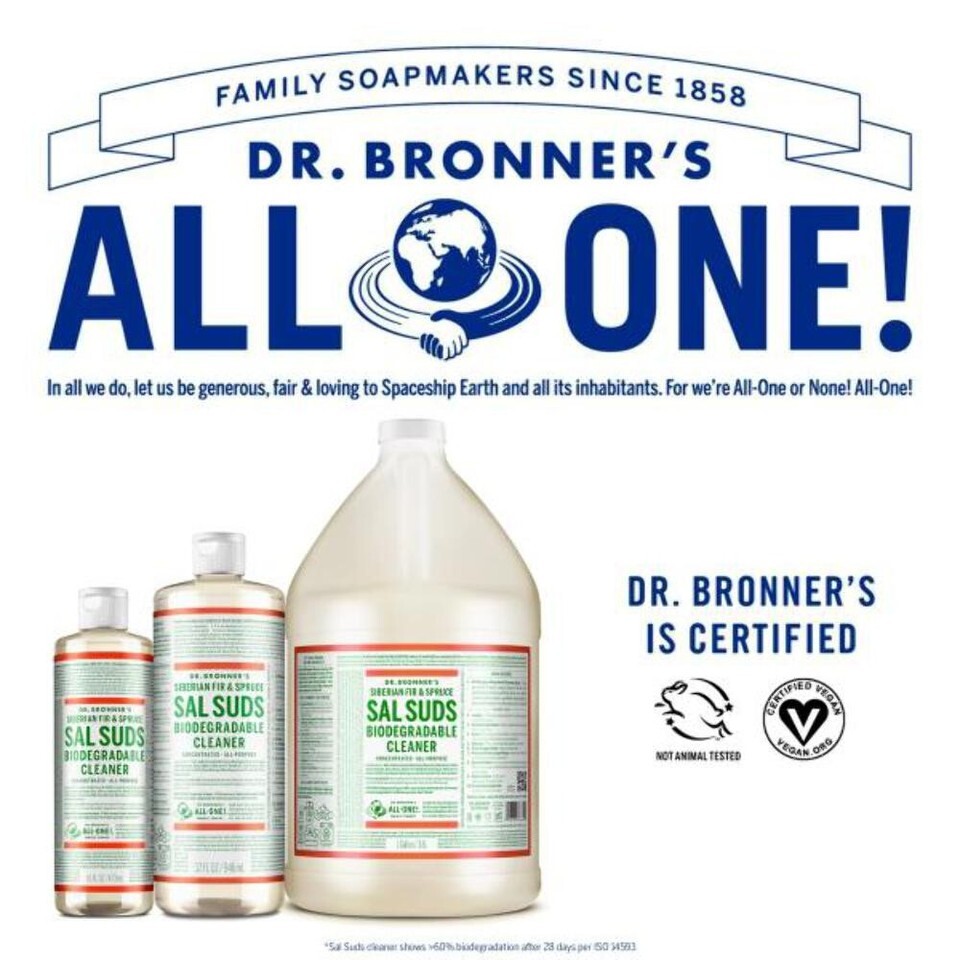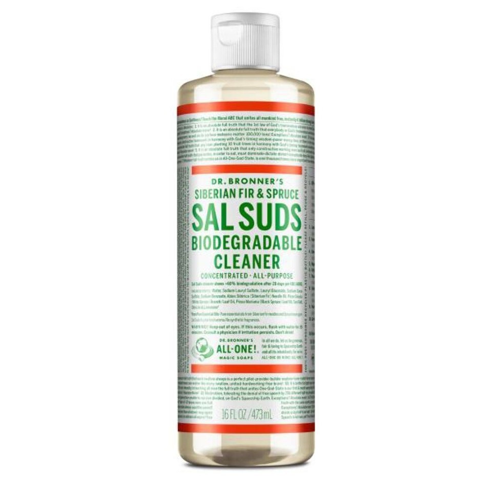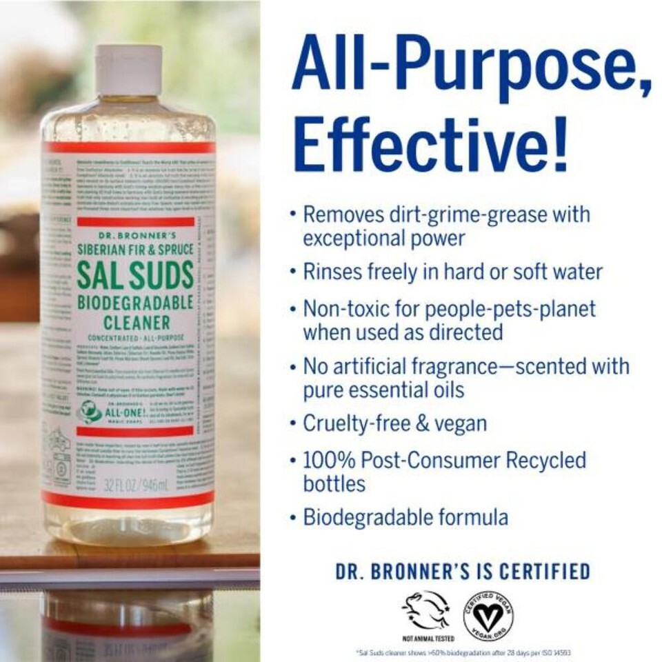 ? VERSATILE ALL-PURPOSE CLEANER: Dr. Bronner?s Sal Suds Biodegradable Cleaner is powerful concentrated enough to clean floors, laundry, dishes, furniture, cars?but gently formulated so it won?t irritate skin! The very best for home Earth! ? PERFECT FOR GENERAL HOUSEHOLD CLEANING: Sal Suds cleans rinses with exceptional power, yet is mild gentle on skin. Equally effective in hard or soft water, rinses freely in hot or cold water. Biodegrades rapidly! ? PLANT-BASED SURFACTANTS THAT WORK: A balanced formulation that cuts grease dirt, generates copious suds, biodegrades quickly fully?can take on tough jobs! Dilute to make your own DIY recipes! ? MILDLY SCENTED WITH FIR AND SPRUCE: Our multi-purpose cleaner is made with pure fir spruce essential oils?fresh forest scent! No synthetic dyes, fragrances or preservatives?no harsh pine stump oil?no phthalates or ammonium compounds?none! ? OUR SAL SUDS ARE 100% CRUELTY-FREE NEVER TESTED ON ANIMALS: Dr. Bronner?s products ingredients are never tested on animals so they qualify for the Leaping Bunny logo. Finally, a product you can totally get behind!