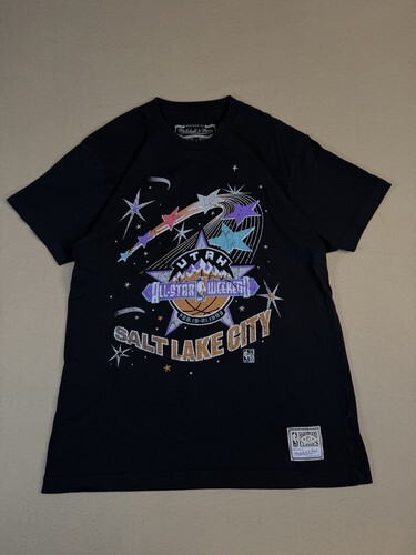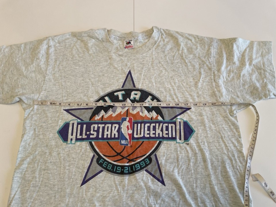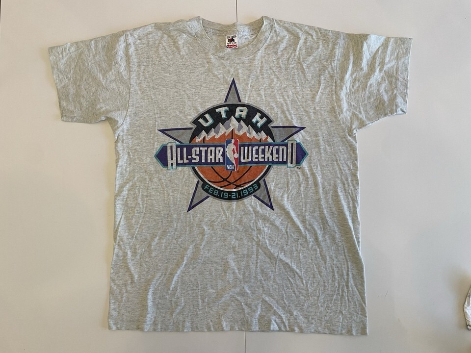 The Vintage 1993 NBA All-Star Weekend T-Shirt, featuring a graphic print of the Utah Jazz logo, is a must-have for any basketball fan. Made of comfortable cotton material, this gray shirt with a crew neck and short sleeves is perfect for wearing in the summer, fall, or spring. The regular fit and XL size make it a great addition to any man's wardrobe, especially for those who appreciate retro sports memorabilia from the 90s. Machine washable and easy to care for, this shirt is a timeless piece for any NBA enthusiast.