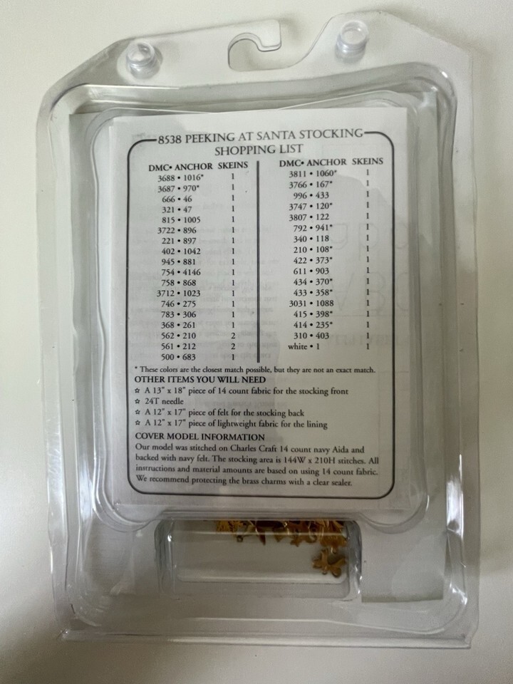 The Dimensions Christmas Counted Stocking CHARTS CHARMS Kit PEEKING AT SANTA 8538 is a cross-stitch kit featuring a holiday-themed stocking design. Made in the United States, this kit includes everything you need to create a festive and detailed cross-stitch stocking featuring a peeking Santa Claus. The brand's reputation for quality craftsmanship and attention to detail makes this kit a great choice for anyone looking to embark on a fun and engaging crafting project during the holiday season.