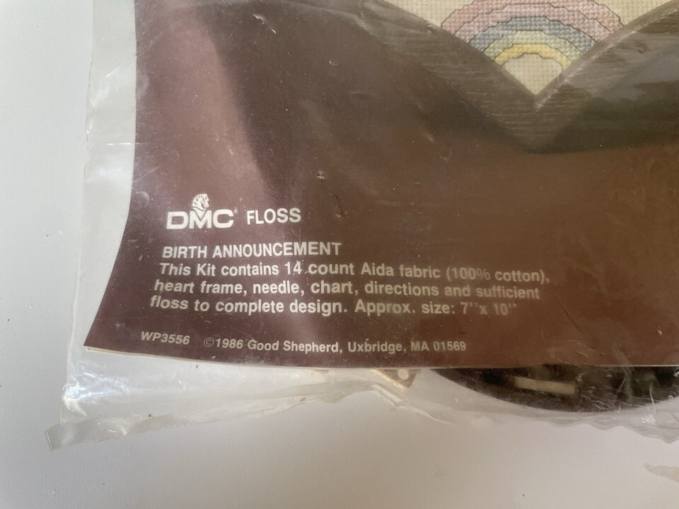 This vintage Good Shepherd cross stitch birth announcement kit (model 83556) includes everything needed to create a framed picture with a heart design, perfect for celebrating a new baby. Made in the United States, the kit comes with a pattern, needle, fabric/cloth, and thread/floss for embroidery. The cross stitch design adds a classic touch to the hand embroidery project, making it a thoughtful and beautiful gift for new parents.
