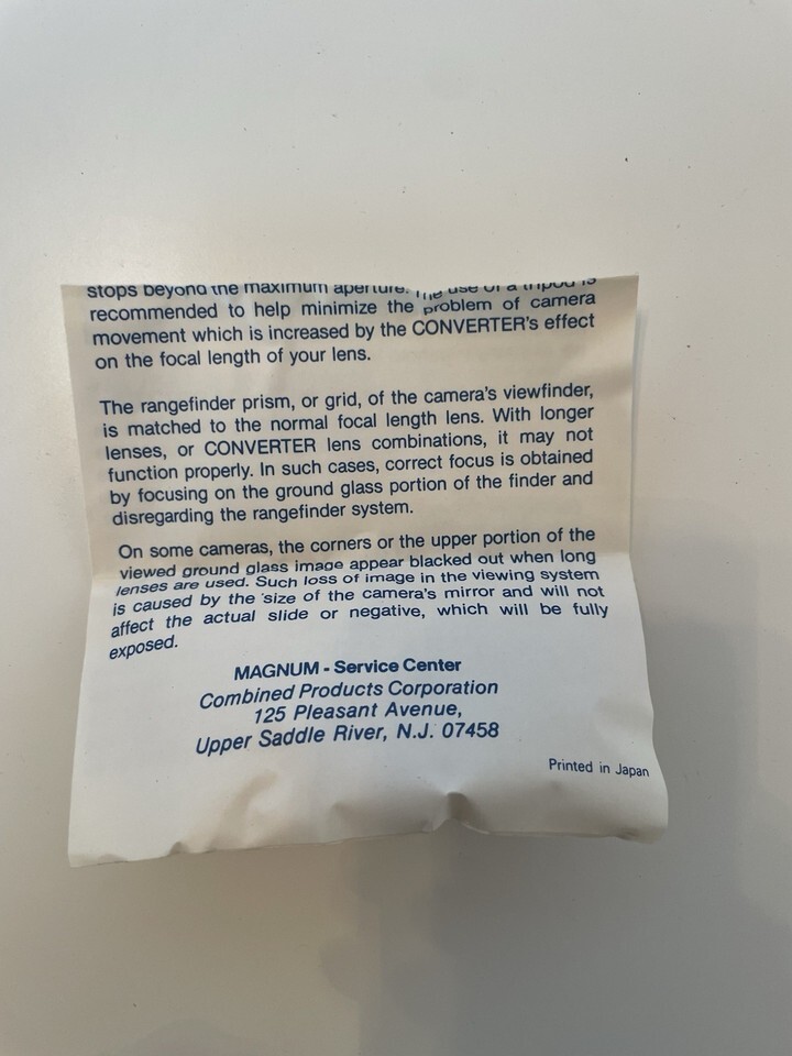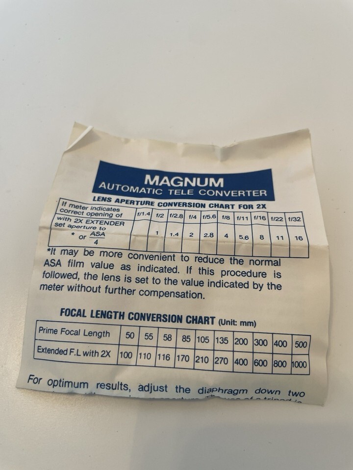 The Canon Magnum Extender 2x Teleconverter is a high-quality accessory designed specifically for Canon FD lenses. Made by Canon in Japan, this teleconverter allows for a 2x magnification of the zoom, effectively extending the reach of the lens for capturing more distant subjects with precision. The manual focus feature ensures accurate and controlled shots, making it ideal for photographers using SLR cameras. This teleconverter comes with a case for convenient storage and protection when not in use.