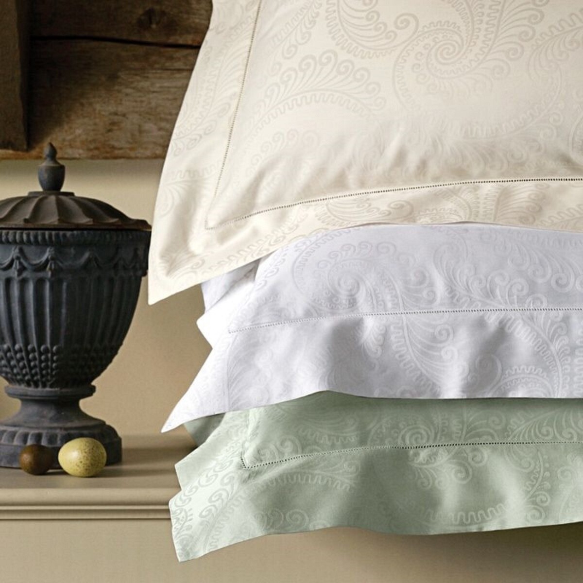 Renown for the smooth and soft hand of our Italian-woven jacquards, Tasso fits the bill for lovely, luxurious comfort. Its graceful stylized fern design is woven from Egyptian cotton yarns in Italy, traditional home of the world's finest textile masters. The result is a bedding collection of refined charm and sophistication, rendered in the soothing tone.