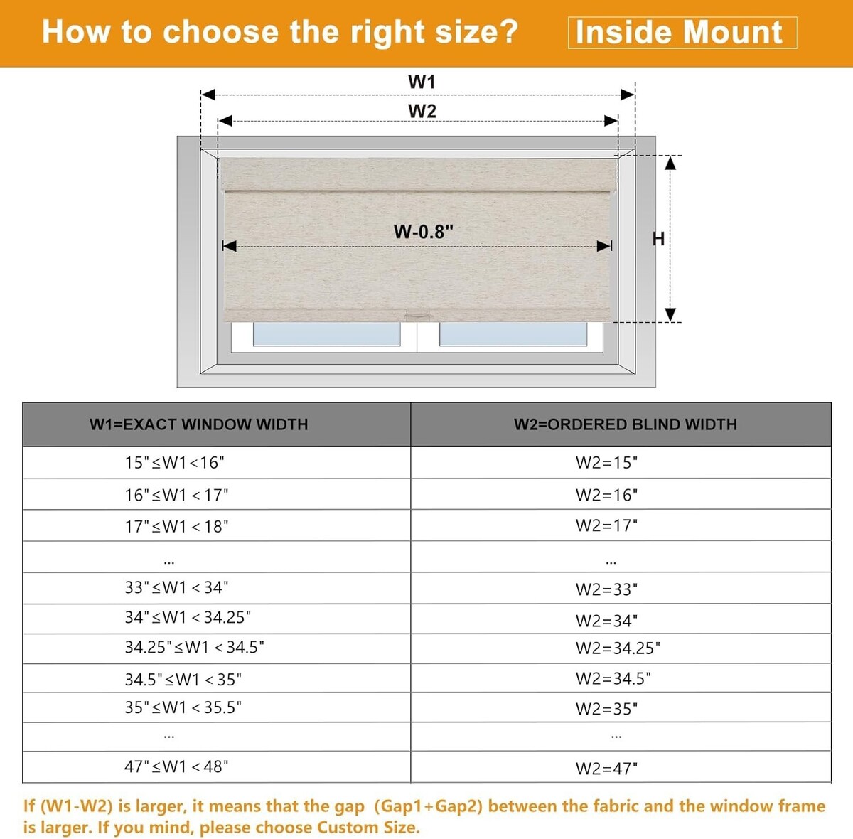 ?How to choose a correct size to fit??INSIDE MOUNT: Shade width = Exact window width (or 0-1 inch less), Shade Height works for window less than 72" high. OUTSIDE MOUNT: Shade width = window width + 4" or more, Shade Height works for window less than 72" high.?Pls Note?Fabric width will be 0.8" shorter than the size of the shade.