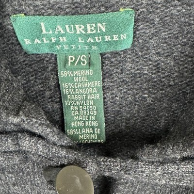 Keywords: Lauren Ralph Lauren, petite cardigan, hooded sweater, cable knit, toggle closure, wool blend, cashmere blend, angora rabbit hair, nylon, gray sweater, women's knitwear, fall fashion, winter wardrobe, cozy clothing, designer cardigan