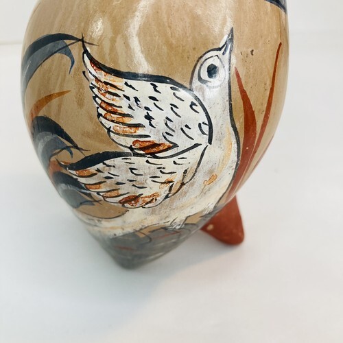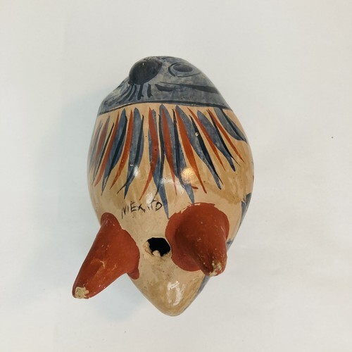 This is a sweet little hand painted Tonala owl from Mexico. Beautifully detailed with folk art designs and a swan painted on the back. Has some minor wear/scuffs to paint due to age as shown. Signed Mexico on the bottom. A great little collectible piece!