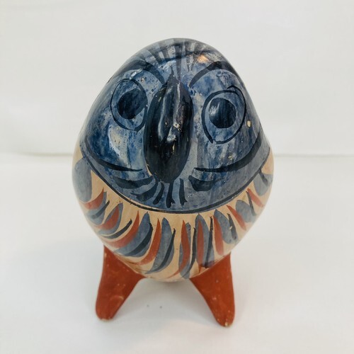 Vtg Owl Mexican Tonala Handpainted Burnished Blue Tan Pottery Folk Art 4? Signed. Nice vintage condition with no chips or cracks. See all photos.