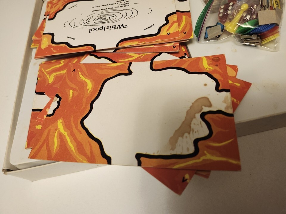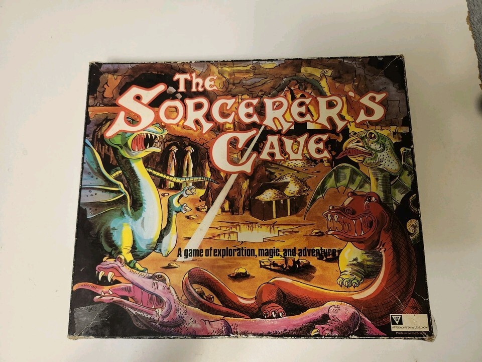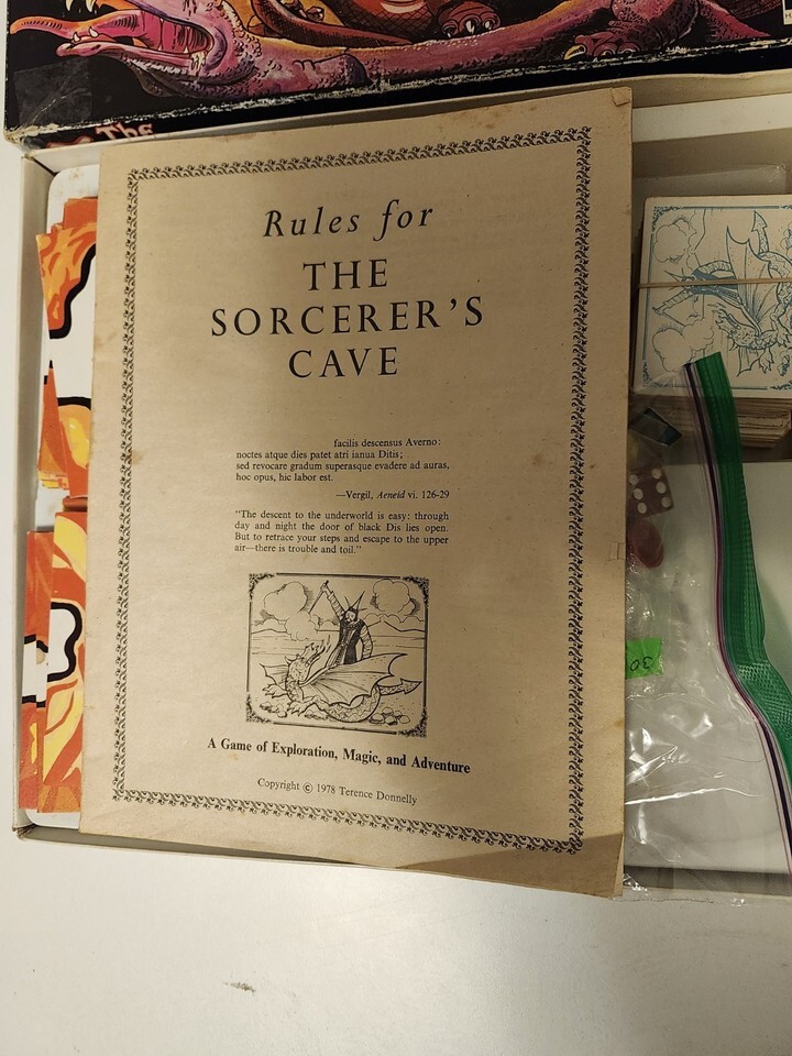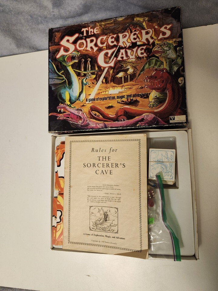 For immediate purchase is this THE SORCERER'S CAVE Ariel 1978 Booklet First Edition for PARTS possible Add on. This game has an inventory that does not correspond with the initial list of contents so it is being sold AS IS, for parts. Some cards, map pieces have staining, normal wear and tear, and box has suffered some damage, has been reinforced with tape. List of contents includes: