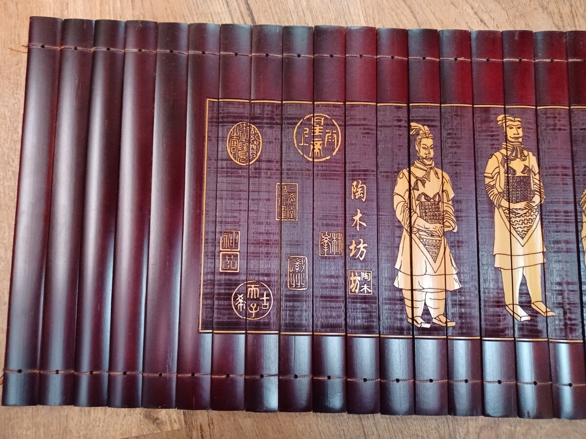 Vintage Chinese Painted Terracotta Warriors & Horse Bamboo Scroll 32" x 9.5"