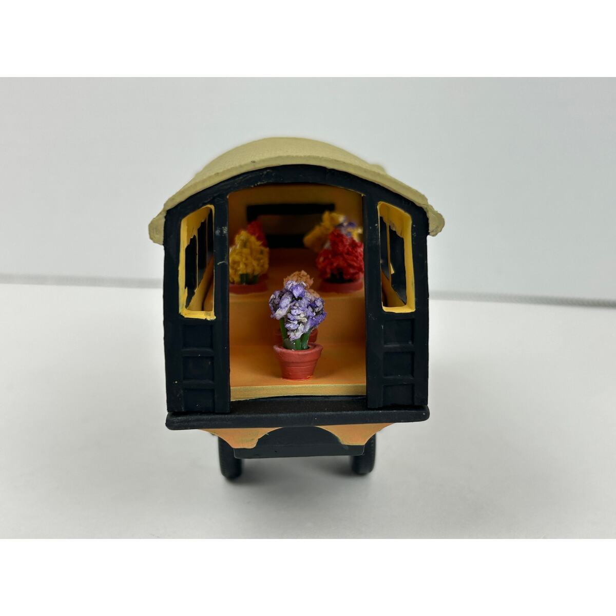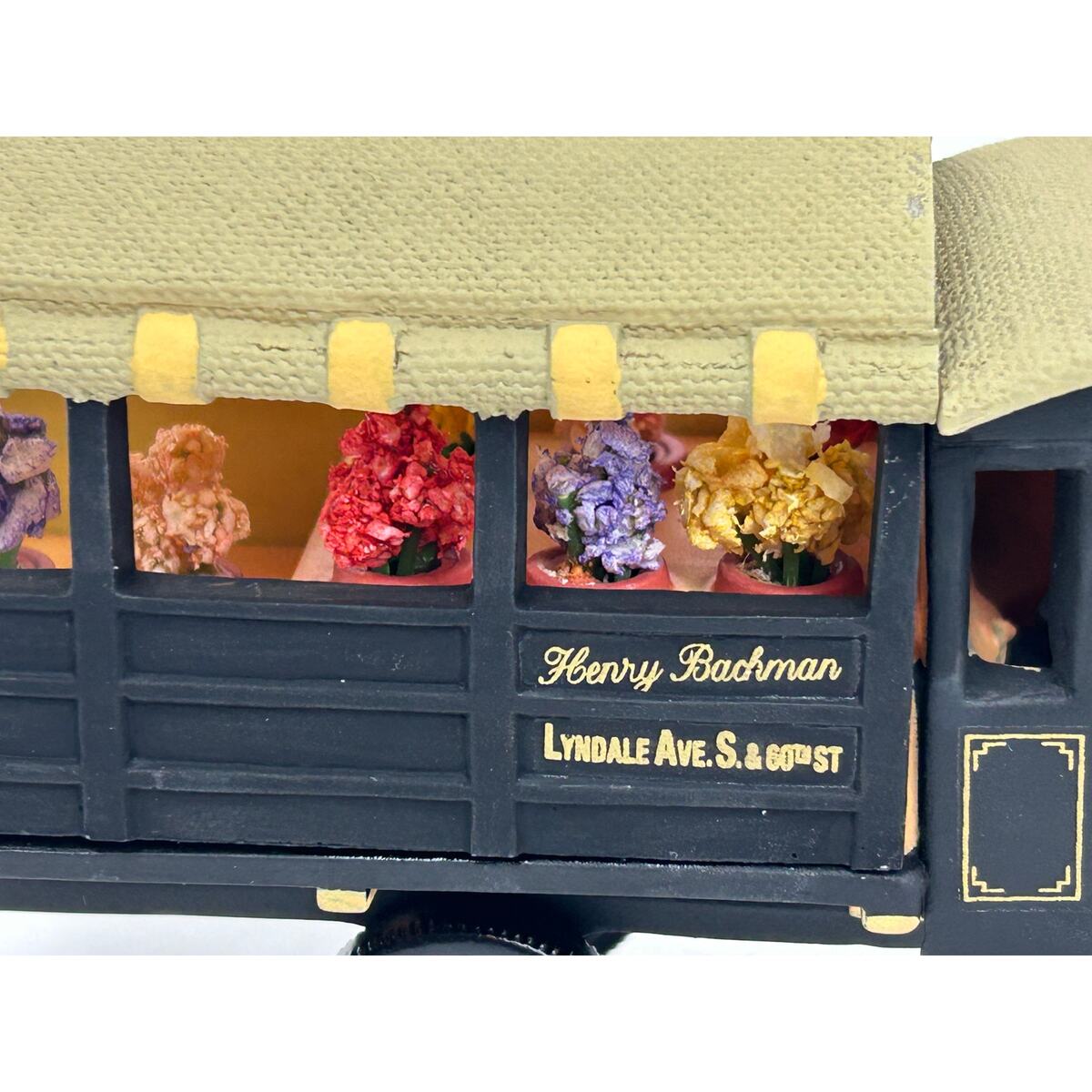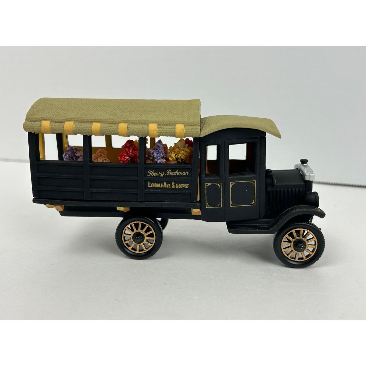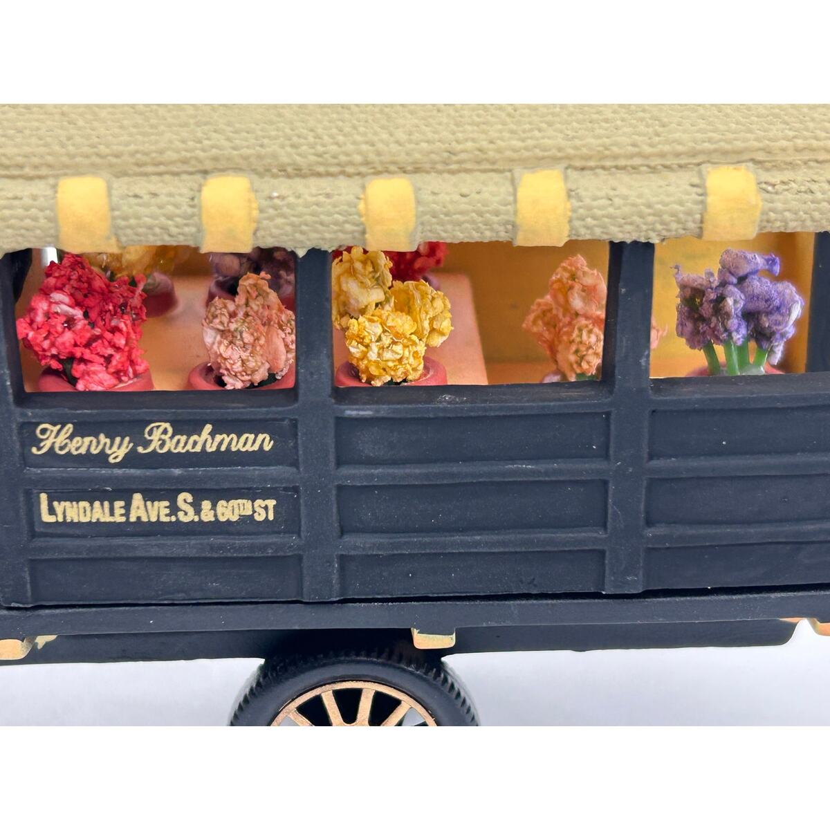 From the Heritage Village Collection, the 1919 Bachman Wilcox Truck (Item #8803, issued 1988?1990) captures early 20th-century charm with a hand-painted porcelain delivery truck marked Henry Bachman, Lyndale Ave. S. 60th St.. The open-bed Wilcox Trux model carries colorful flower pots beneath a tan canopy, a distinctive detail of Department 56?s early accessory craftsmanship.