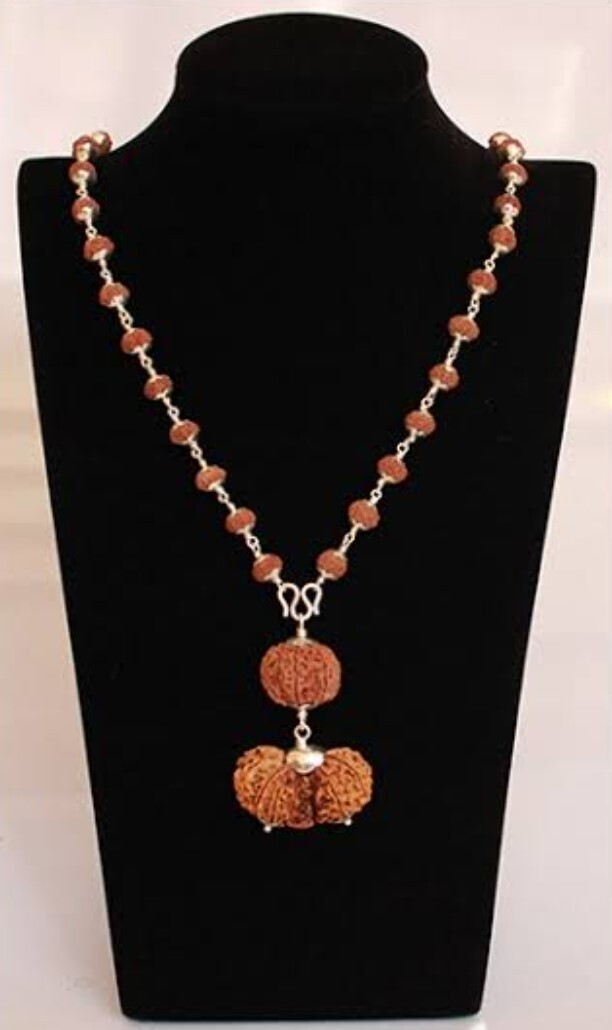 Design : one bead of Collector size 7 Mukhi Rudraksha , one bead of Nepali 14 Mukhi Gauri shankar Rudraksha , Linked with Rudraksha mala in pure silver .