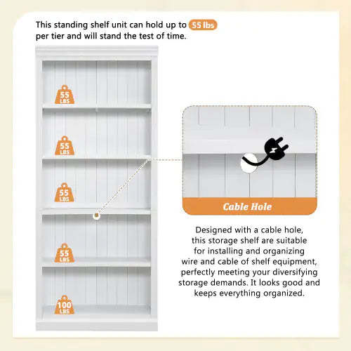 5-Tier Solid Wood Bookshelf – Adjustable Freestanding Storage (White)