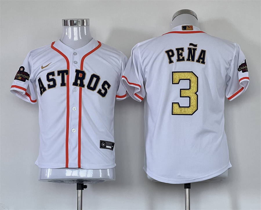 Men’s Jeremy Peña #3 White Baseball Jersey Gold Number Champions Patch