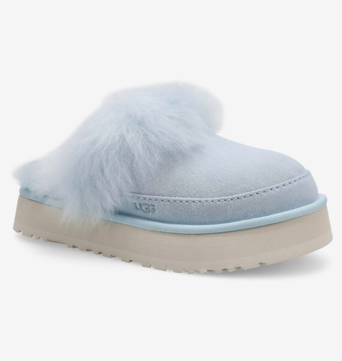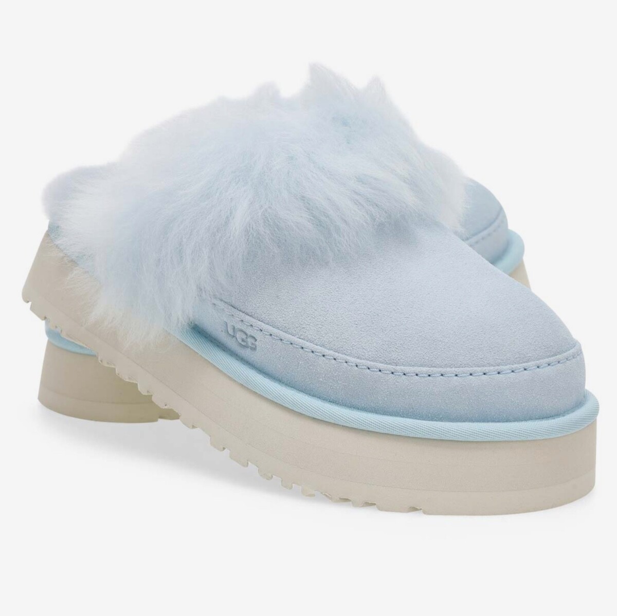 When the weather outside is frightful, the Disquette Chalet sheepskin slipper from UGG, is so delightful. This decadent slipper delivers surrounding warmth, from the sheepskin insole and UGGplush lining to the fluffy sheepskin collar. Designed to be worn both indoors and out, it's set upon a 1 inch platform made from lightweight (and super cushy) sugarcane EVA.