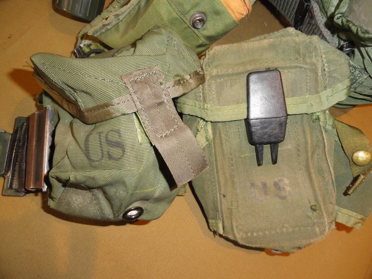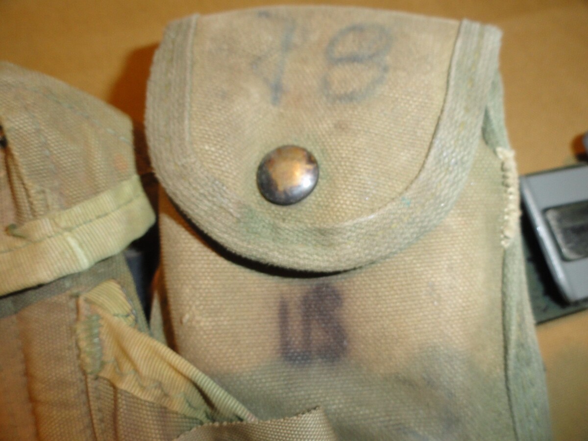 POUCHES AND ACCESSORIES SHOWS WEAR : I COULD EASILY WASH THIS WHOLE RIG, BUT I BELIEVE EVERY SCUFF, EVERY MARKING, EVERY SCRAPE IS A BATTLE SCAR FROZEN IN TIME. EVEN WHEN A SOLDIER, AIRMAN, MARINE, SAILOR WRITES THEIR NAME OR UNIT ON THEIR EQUIPMENT ITS A PIECE OF ART THAT LIVES FOREVER.