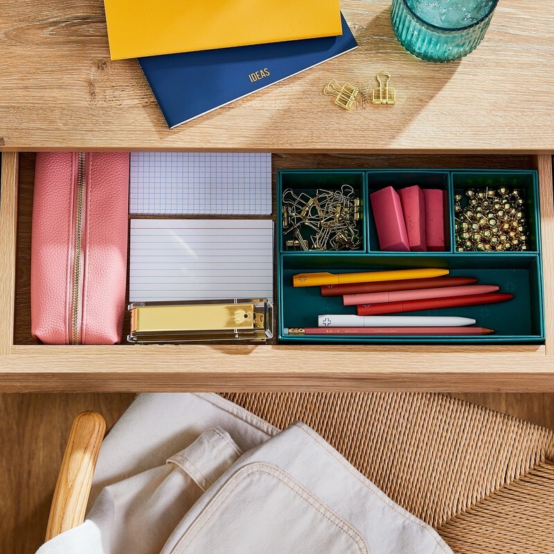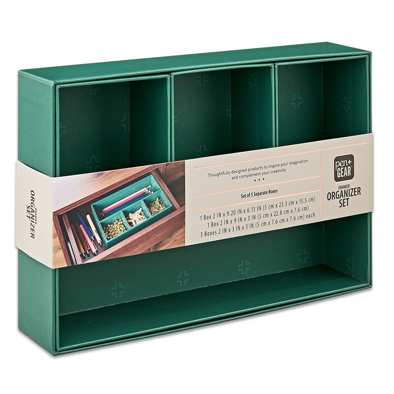 Pen+Gear 5-Piece Drawer Organizer Set, Green Emerald 5 separate bins for flexible storage Great for all your drawer storage needs Stunning emerald green color 1- 9" x 2" x 6" tray 1- 9" x 2" x 3" tray 3- 3" x 2" x 3" trays Pair with other Pen+Gear products