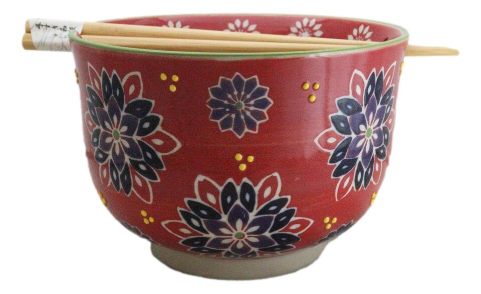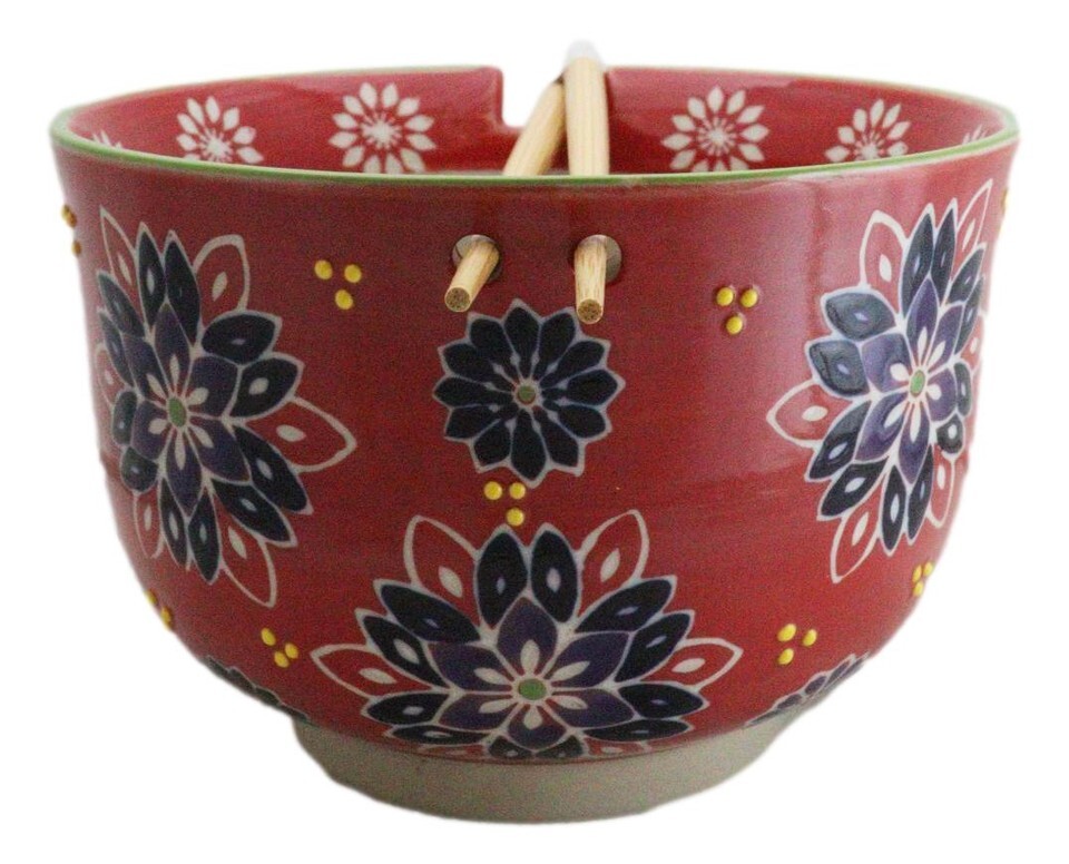 Red String Flowers Floral Art Large 24Oz Donburi Ramen Bowl With Chopsticks Set