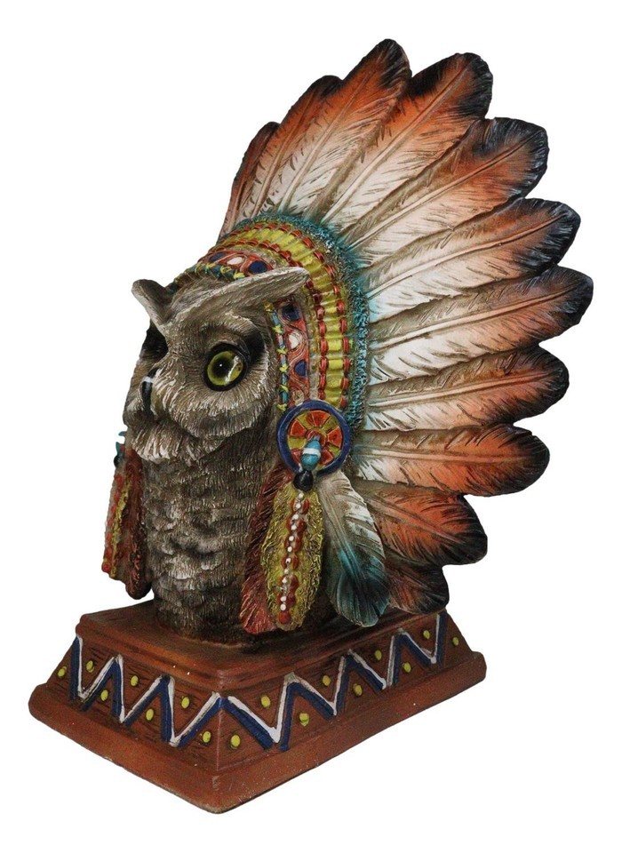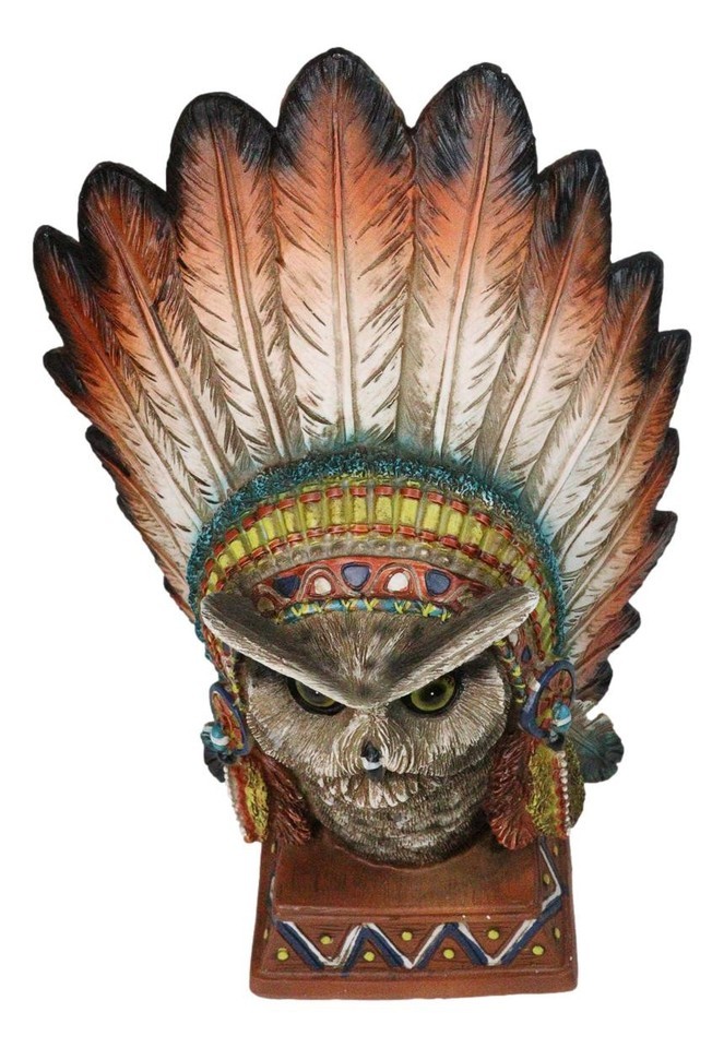 Native American Indian Great Horned Owl Chief With Roach Headdress Figurine