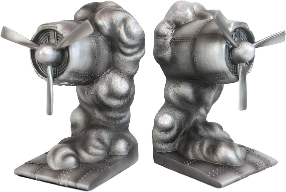 ? These Airplane Propellers Bursting Out Of Clouds Bookends Set is made of designer composite resin, hand painted and polished individually. The sculptures are painted in silver finish for an industrial classic look. Color tone may vary slightly from pictures.