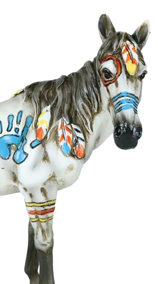 ? This sculpture showcases the thoroughbred pride of the native equestrian family. Beautifully sculpted and painted, this figurine accentuates the spiritual medicine horse. A white horse, symbolizing purity, is painted with the heavenly sun, blue palm print, feathers and stripes throughout the horse's body and head.