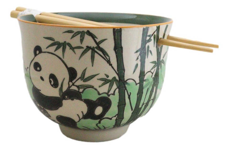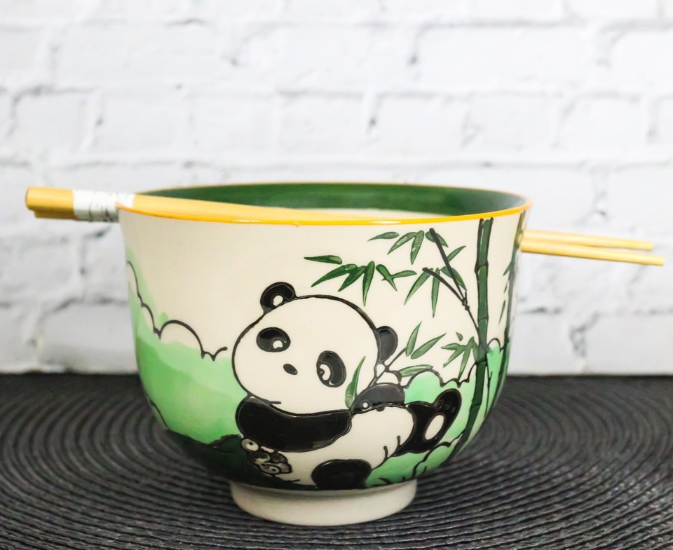 Bamboo Forest Green Panda Bear Ceramic Donburi Ramen Bowl With Chopsticks Set