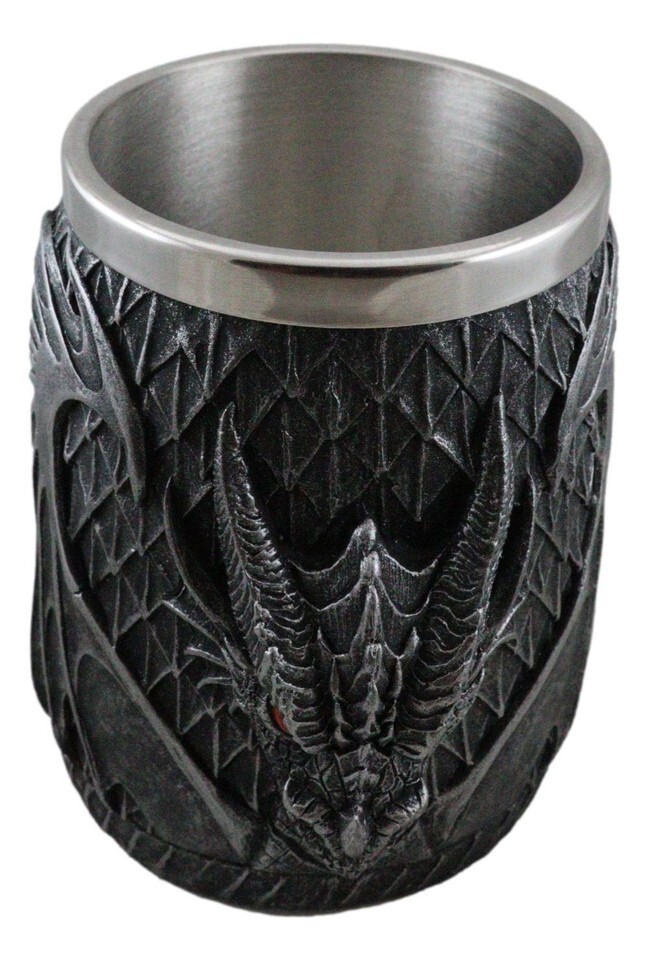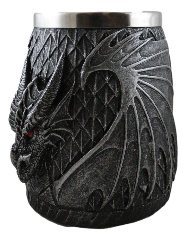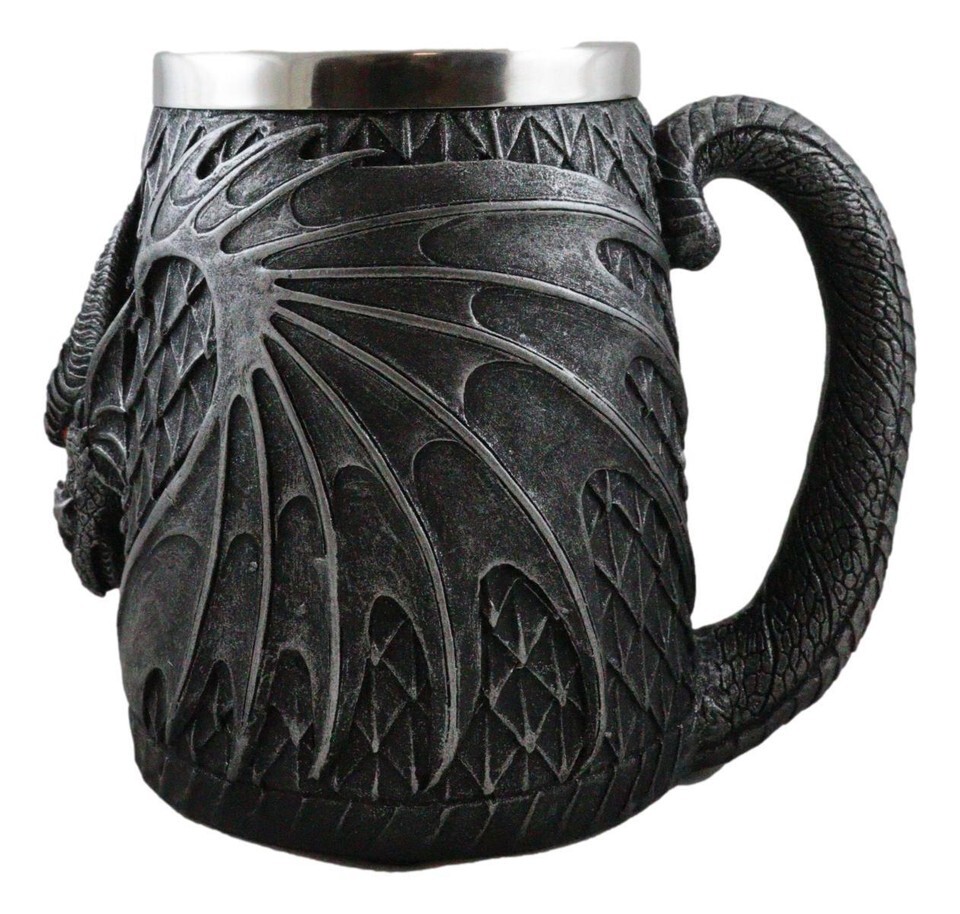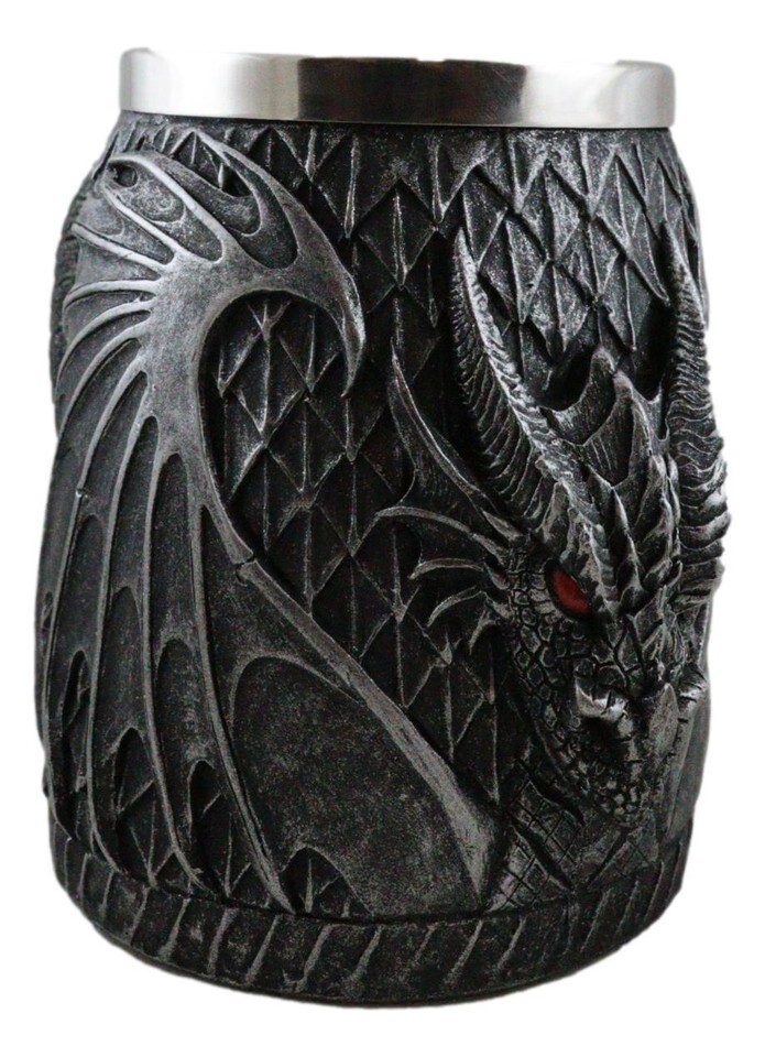 ? This fantasy tankard mug features a winged dragon with bloodshot eyes. The handle is reminiscent of a dragon's tail, and the dragon's scales curve around the body of the mug. A stainless steel insert makes drinking and cleaning easy and practical!