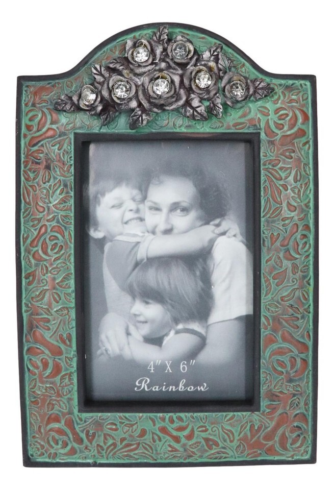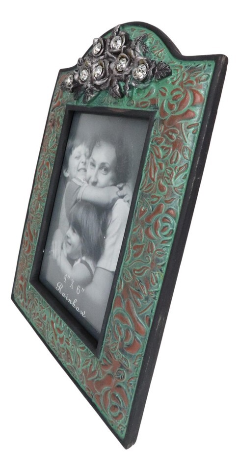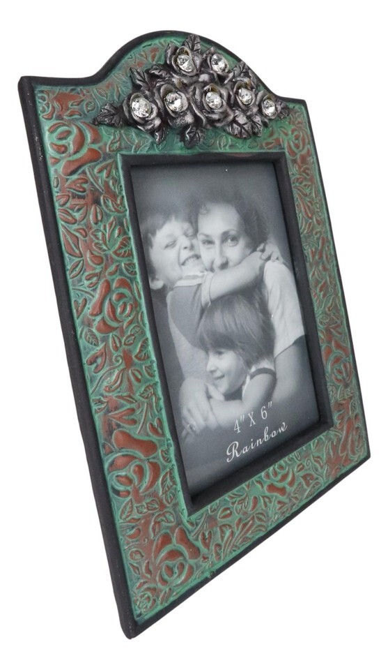 ? Western decor is all about spunk and spirit, bringing together the desert beauty of the southwest and all its inhabitants with rugged cowboy charm and rustic good looks. This photo frame features tasteful floral scrollwork patterns etched on faux tooled leather background. A cluster of silver roses decorate the top of the photo frame. In the center is rectangular shaped window for your 4"X6" photo.