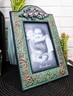 ? This Silver Roses And Turquoise Floral Photo Frame measures 9.25" Tall, 6.25" Wide and 1" Deep approximately. It weighs about 1.25 pounds. The photo frame holds 4" by 6" photos.