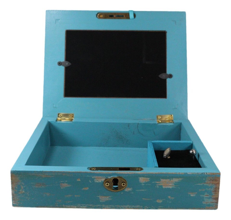 ? Distressed Locket Boxes are perfect to keep your treasured possessions and keepsakes. Handcrafted wood with distressed finish, this music box features a locket attached to trendy jute rope and a functional vintage lock with a turn-style key. Insert a personal photo in both the beautiful metal locket and replace artwork with a picture. Wind-up, traditional musical mechanism is contained within the box.