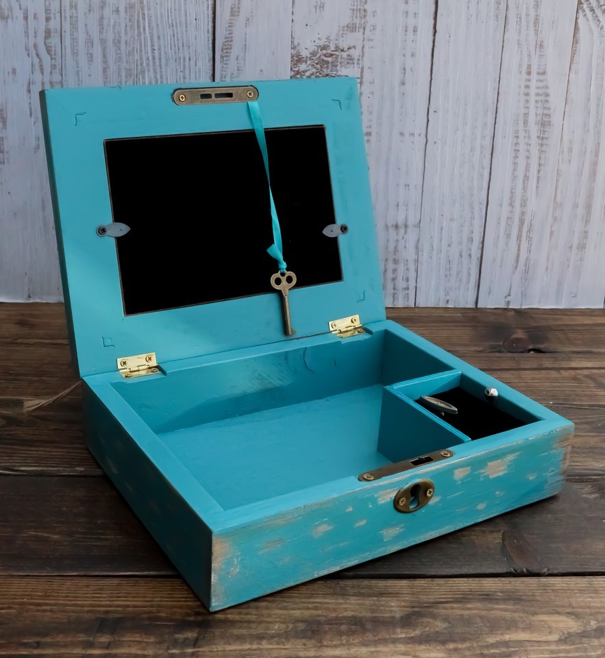 ? Distressed Locket Boxes are perfect to keep your treasured possessions and keepsakes. Handcrafted wood with distressed finish, this music box features a locket attached to trendy jute rope and a functional vintage lock with a turn-style key. Insert a personal photo in both the beautiful metal locket and replace artwork with a picture. Wind-up, traditional musical mechanism is contained within the box.