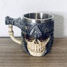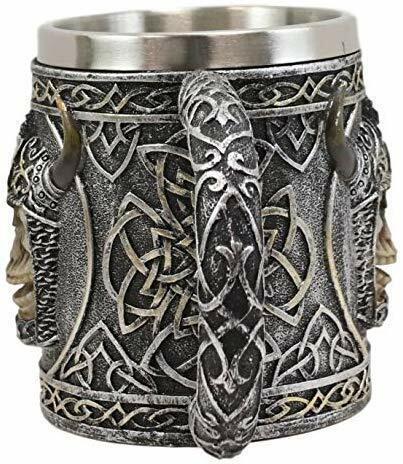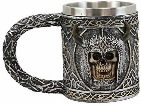 ? This Viking Berserker Skull Mug is made of fine polyresin body and stainless steel drinking liner, hand painted and polished individually.