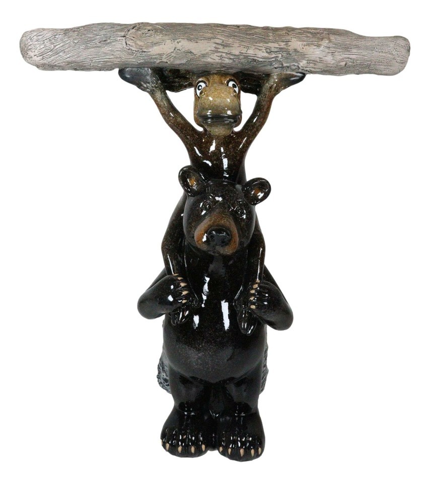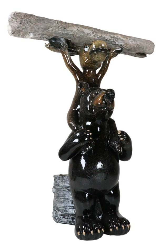 ? This is an interesting novelty wine valet featuring a bear and a moose displaying an acrobatic performance. With the black bear at the bottom piggybacking the moose, the moose is suspending a heavy log with his arms stretched out wide. The log can hold 2 wine glasses while a birchwood bucket sits at the back of the bear to hold your wine bottle.