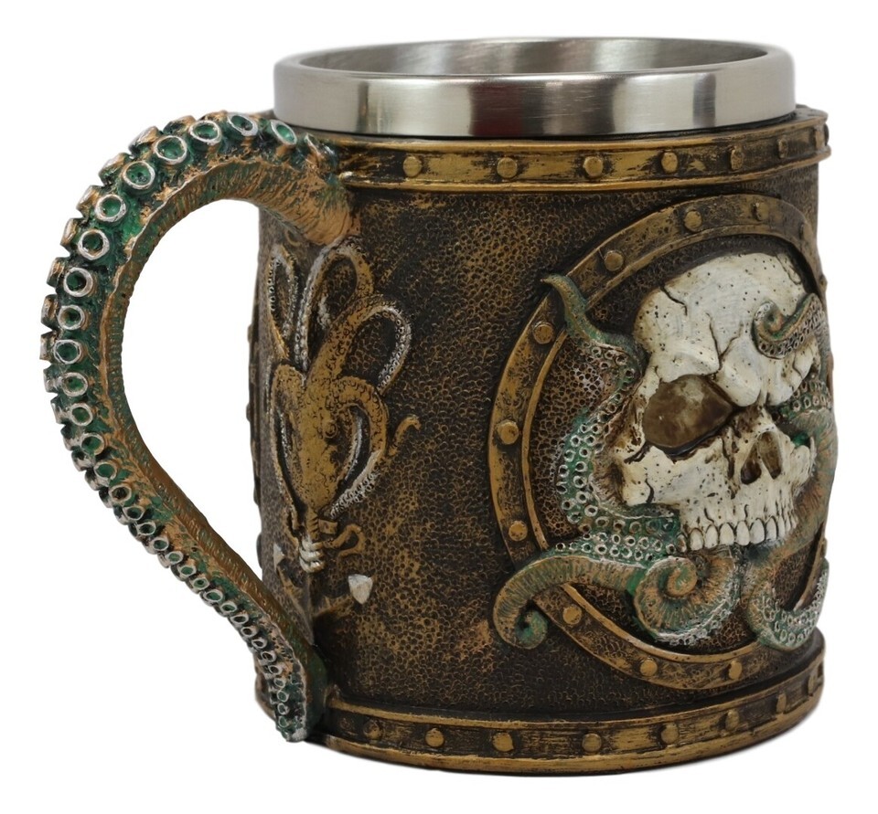 This Cthulhu Octopus Wrecking Skull Porthole Wine Goblet is made of fine polyresin body and stainless steel drinking liner, hand painted and polished individually.