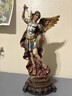 ? This statue of "St. Michael" depicts the archangel Michael entrenched in battle with Lucifer. It is the final scene of the Battle of Armageddon, with the Saint holding a shield of faith with the Cross and throwing a javelin spear from the clouds. On the base of the sculpture you will find a brass name plate with Archangel Michael engraved.