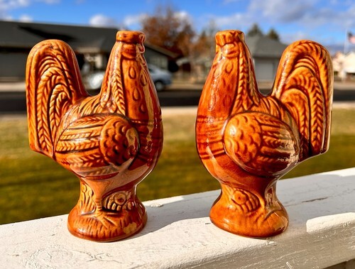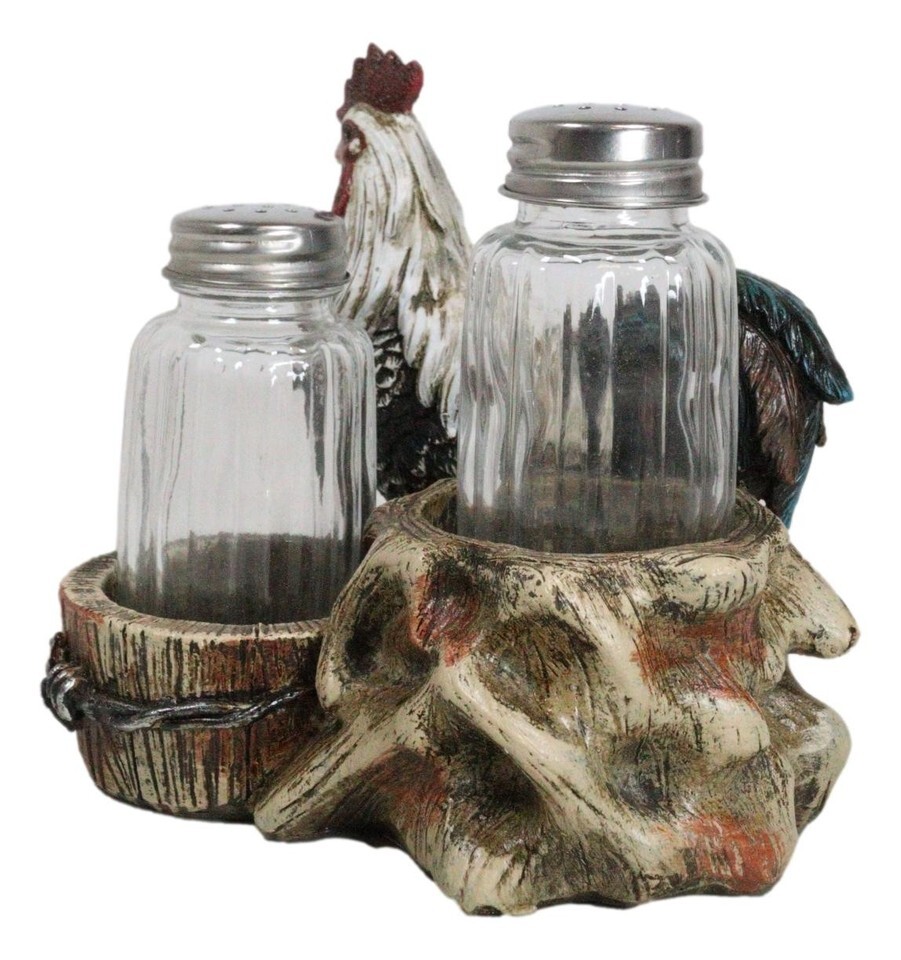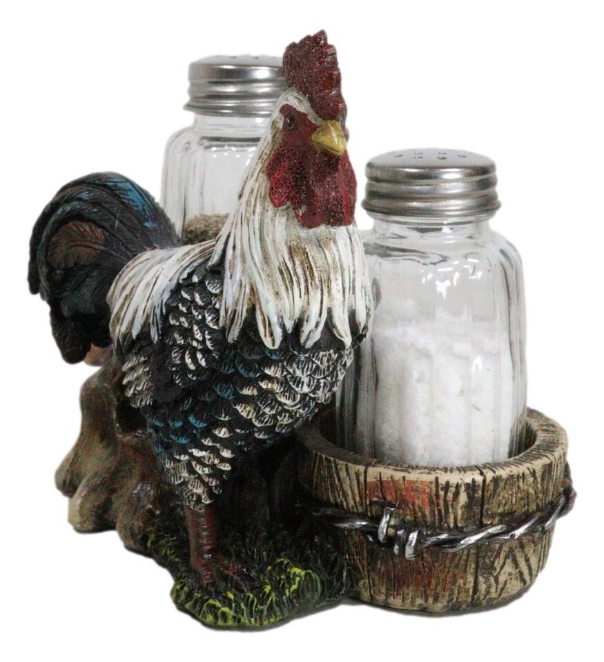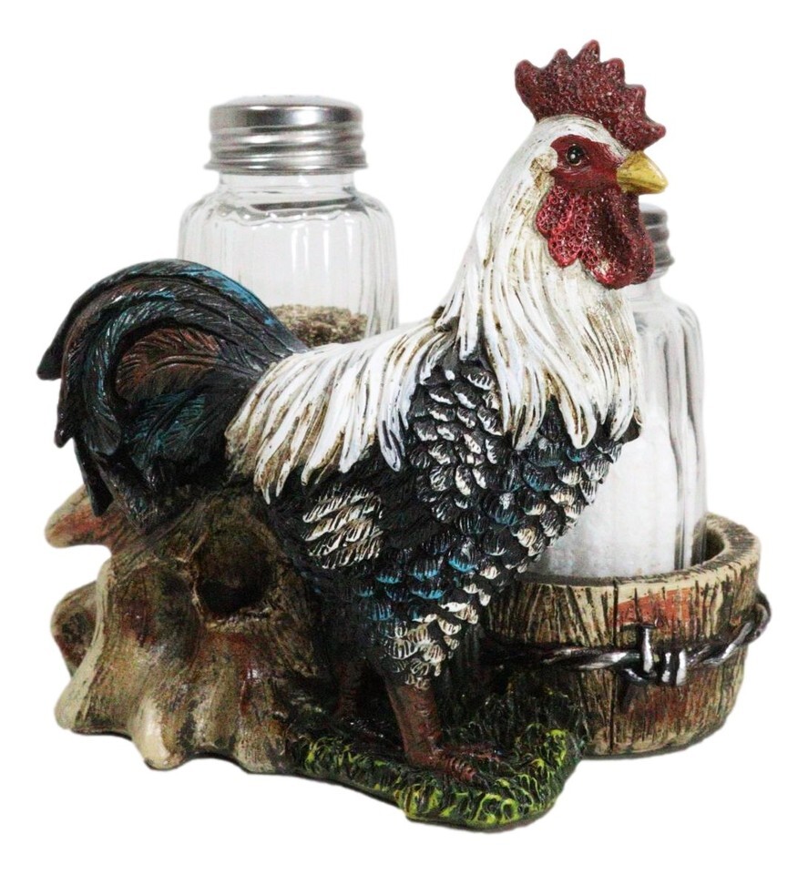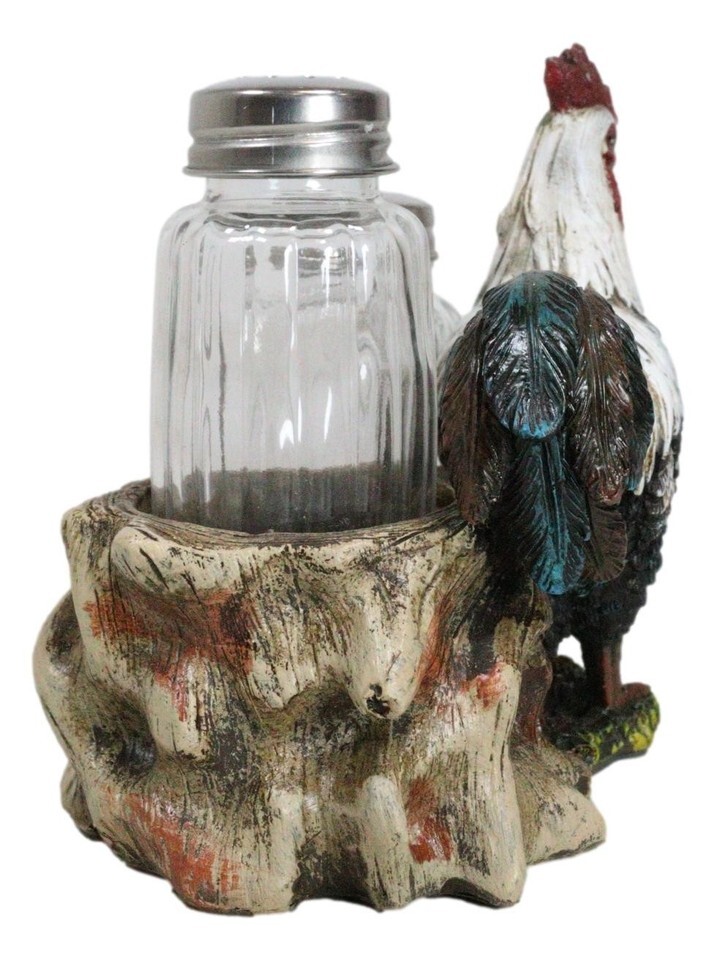 ? This Rooster Salt And Pepper Shakers Holder figurine is made of polyresin, hand painted and polished individually. Color Tone may vary from pictures.